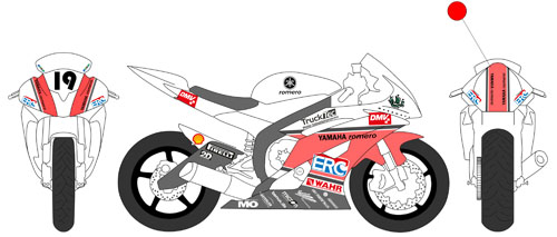 Dieses kleine Projekt hatte zum Ziel, Sponsorenlogos auf einem Rennmotorrad zu visualisieren. Zusätzlich wurden die Stellwände für die Box gestaltet. |